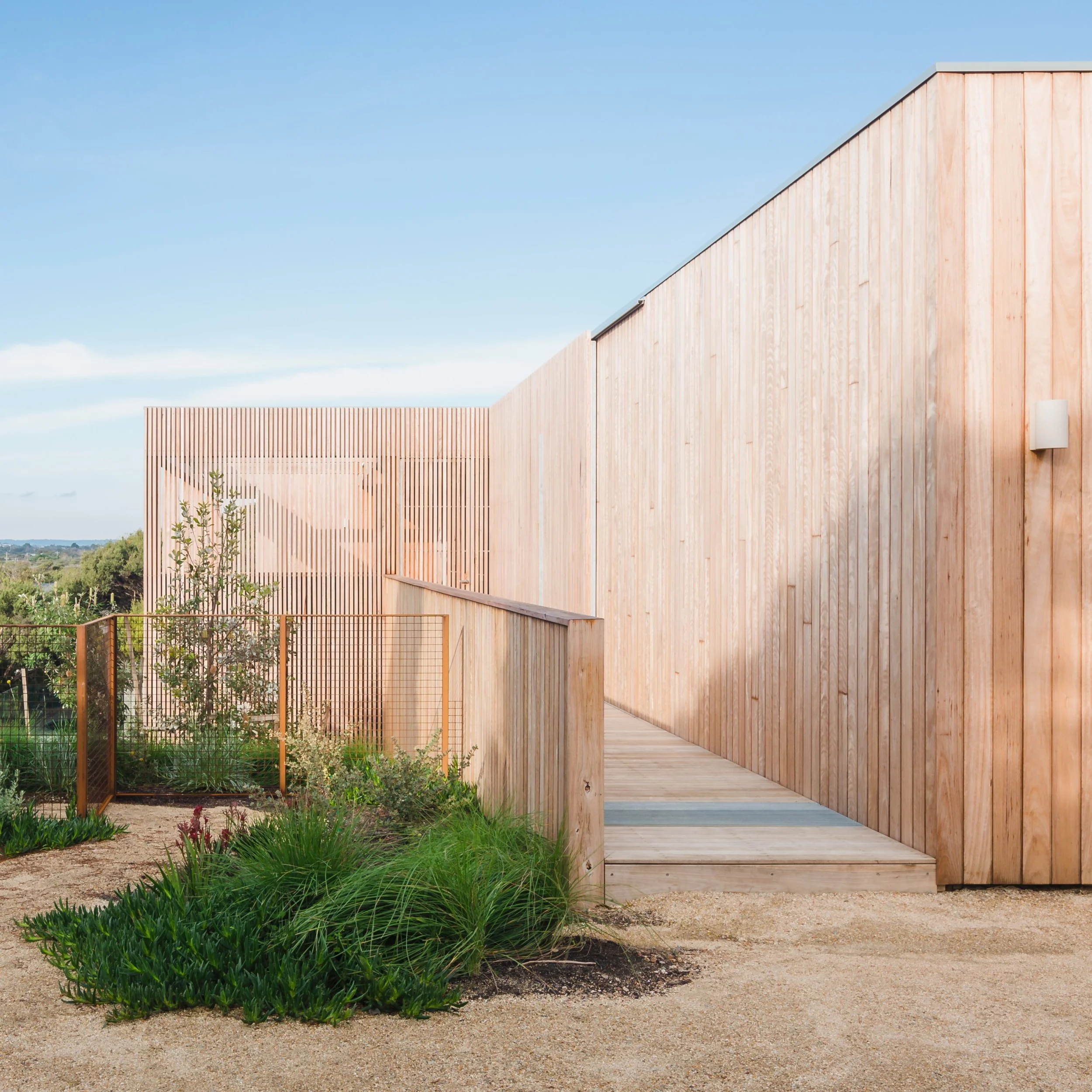 Nestled into the dune fringes of Point Nepean National Park, this timber clad home delicately navigates level changes, views and solar access, creating a relaxed beachside retreat. Complimented with a native coastal garden, the house sits comfortably within its surrounds and includes a pair of ‘rockpools’, a subtle nod to what is to be found a short stroll away over the dunes.